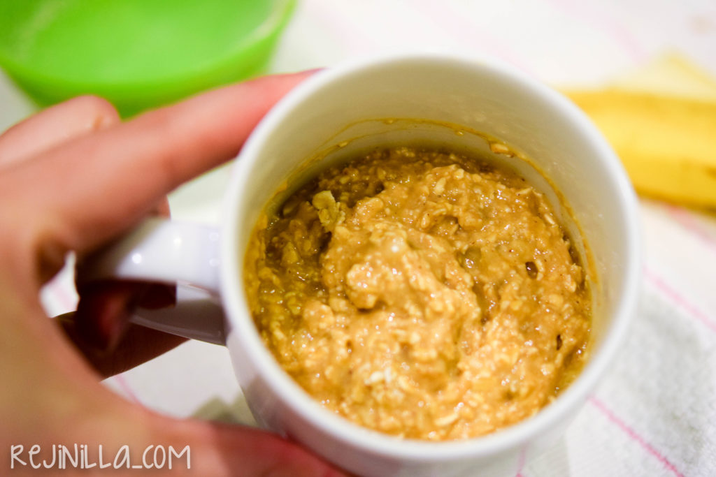 Ahora agrega los ingredientes secos… mezcla bien y mete al microondas. Cocina a temperatura media por un minuto. El centro estará cocido y el pastelito inflado. Puede necesitar unos 20 segundos más, dependiendo del microondas.