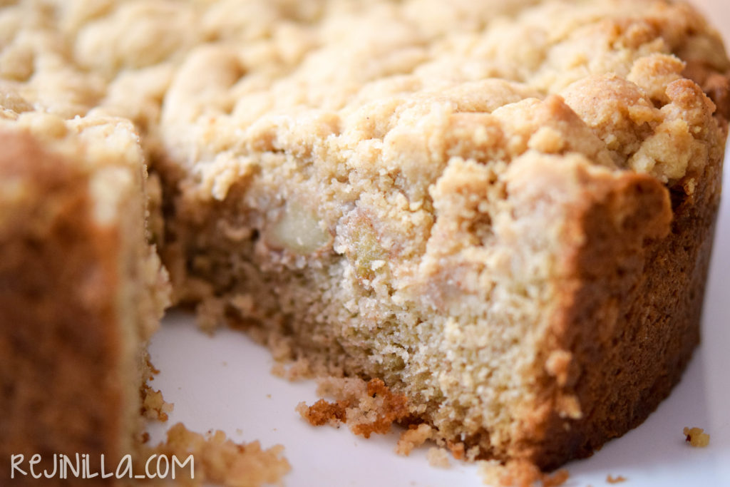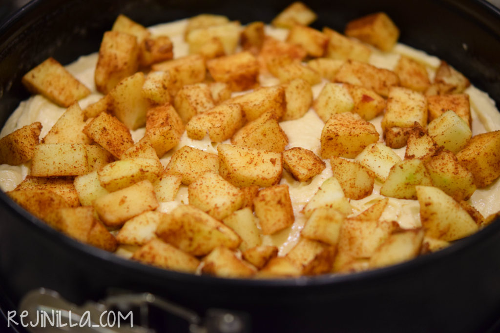 En un molde engrasado y enharinado, vacía la masa del pastel, esparce con una espátula. Espolvorea los trozos de manzana y encima espolvorea la mezcla del topping, con una cuchara aplasta ligeramente para que se pegue al pastel.