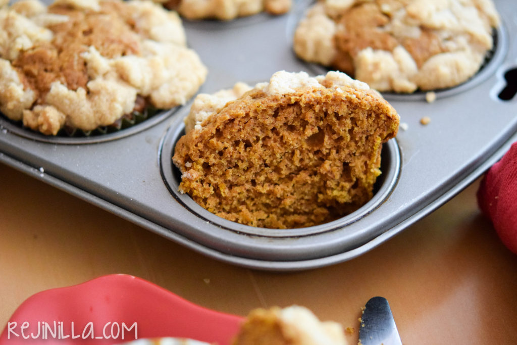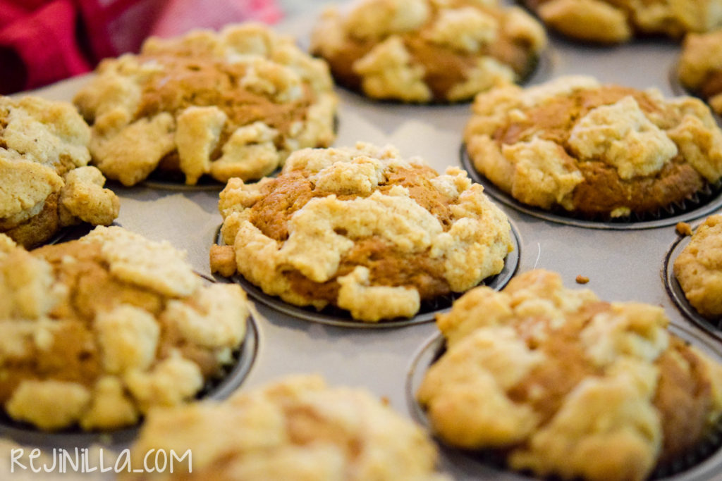Encima, espolvorea un poco de la mezcla de galleta en pedacitos sobre cada muffin, aplastando ligeramente para que los pedazos se “peguen” a la base de muffin.