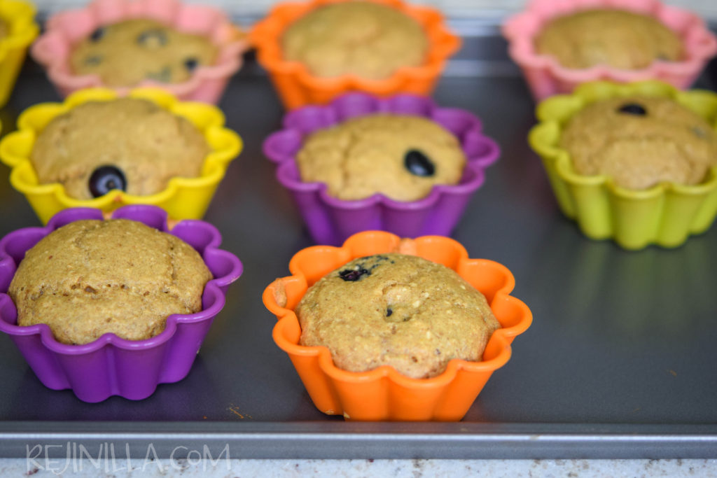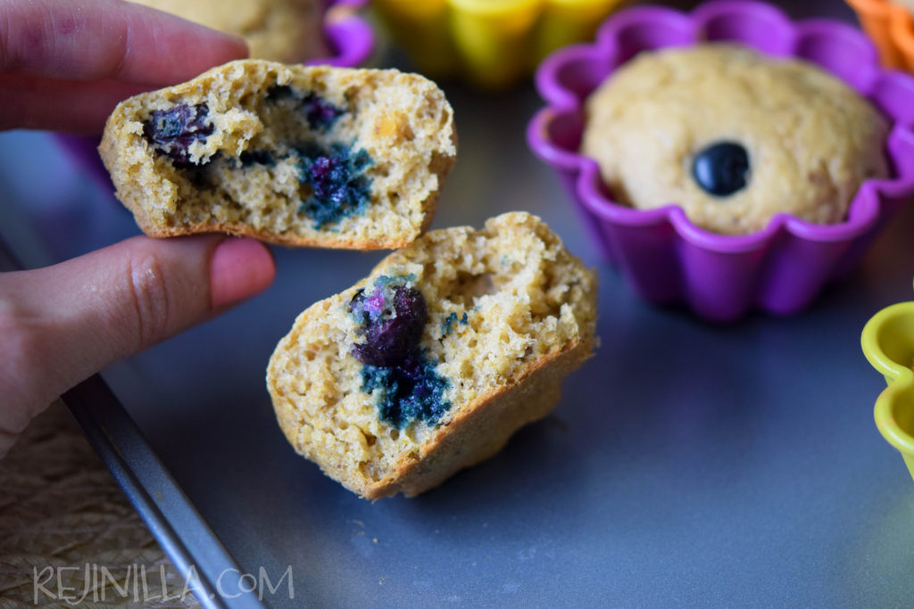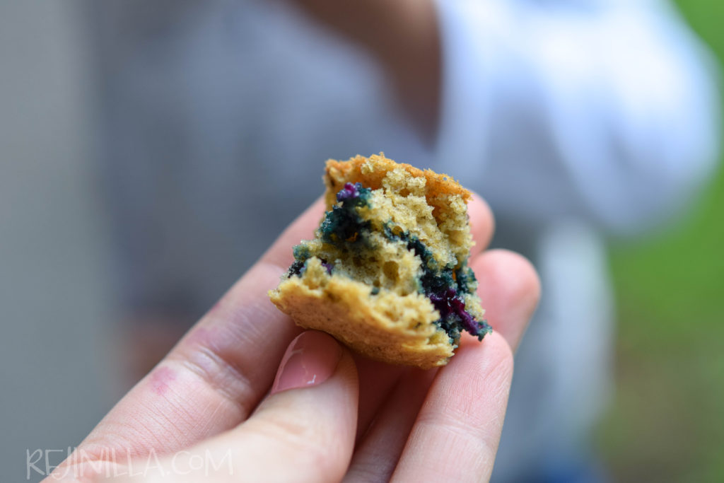 Después de su estancia en el horno, vean su esponjosidad. Nadie nunca adivinaría que no tienen ni grasa, ni azúcar refinada, ni lácteos, que son buenos para ti, etc, etc, etc. También me encanta como toda la masa se pinta de azul verdoso.