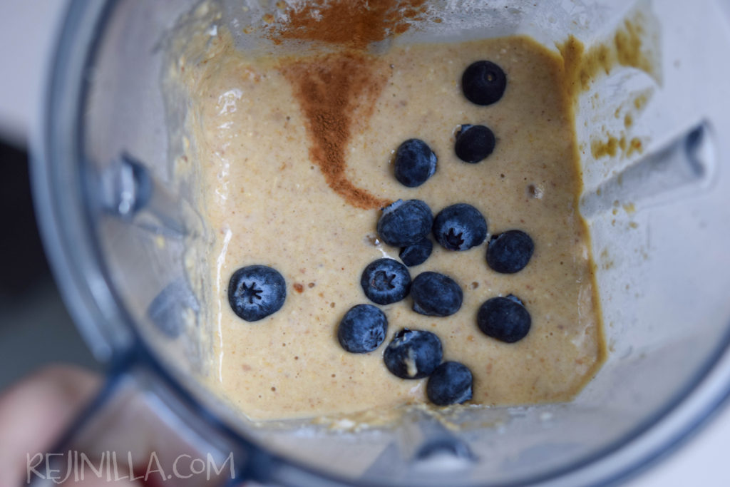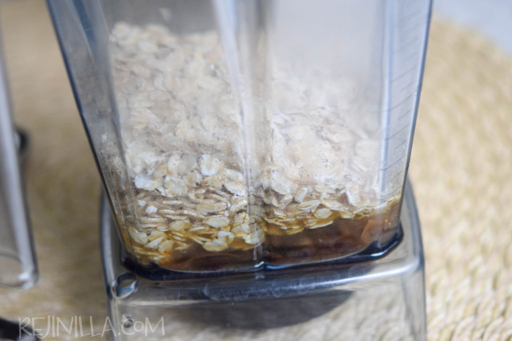 Ahora al vaso de la licuadora, junto con los dátiles, agrega la avena, leche, vainilla y huevo. Pulsa para hacer que el dátil se deshaga y todos los ingredientes se integren.
