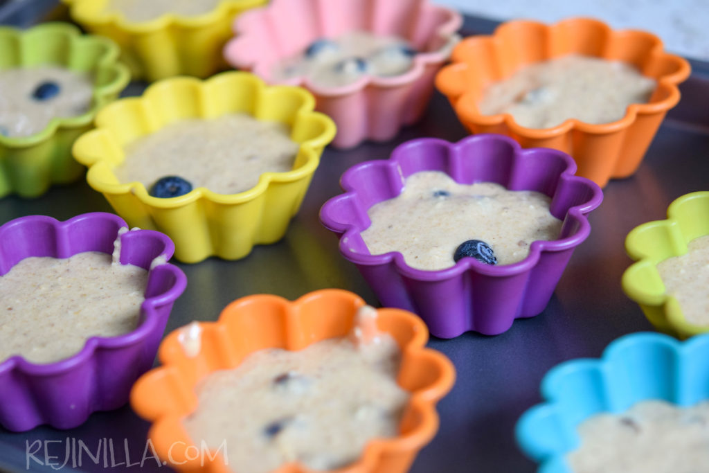 Por último las moras. Echalas al vaso de la licuadora pero mezcla sólo con la espátula, y sirve en moldes para cupcakes, con capacillo, de silicón o ligeramente engrasados y enharinados.